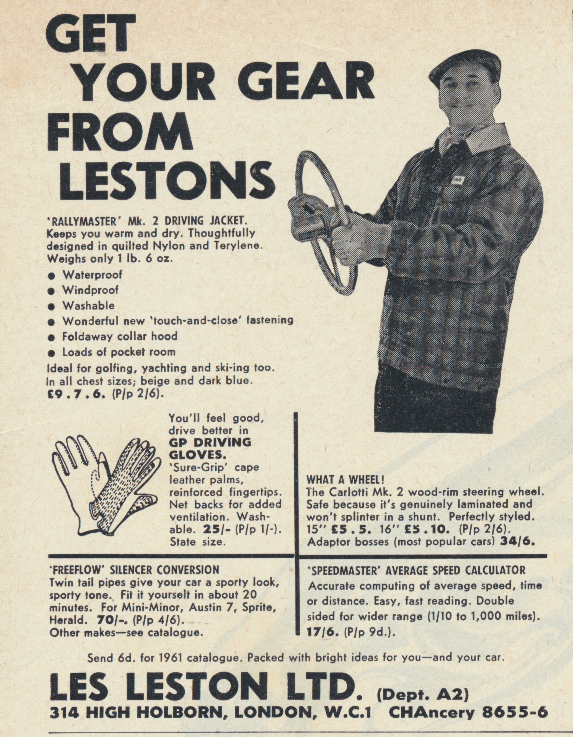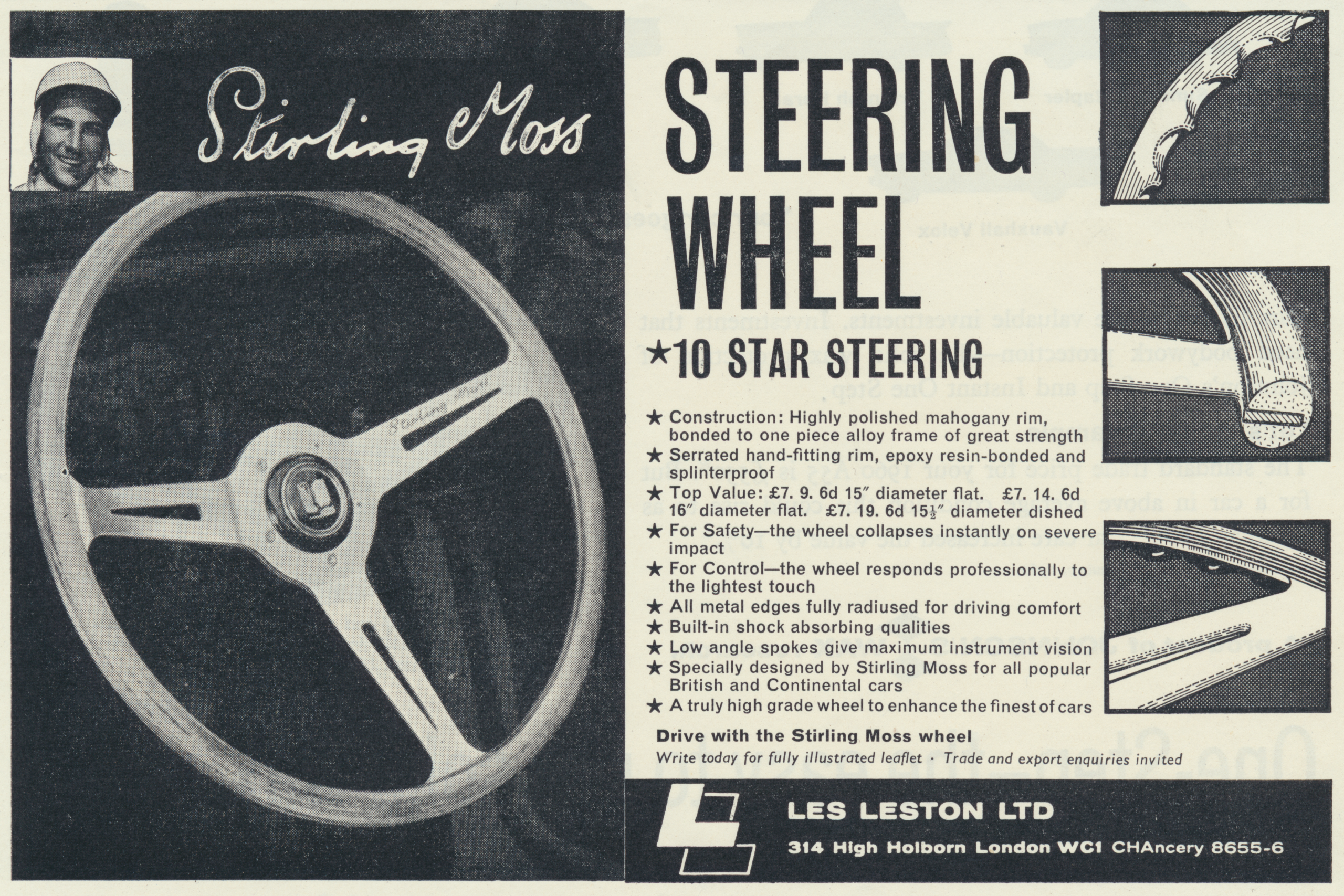 After WWII, Les began his business career by acquiring surplus aeronautical equipment and founding Aero Spares, which led to significant success. The profits enabled him to enter motorsport and launch Les Leston Accessories, a well-known brand selling parts like steering wheels, gear levers, and flame-proof racing overalls. His business expanded through the 1950s and 1960s, helped by his reputation in motorsport.